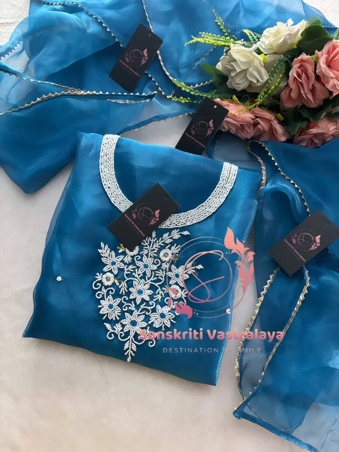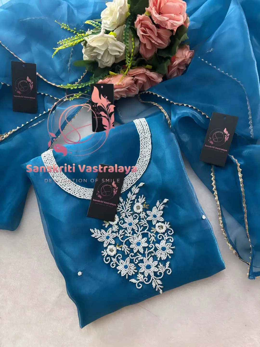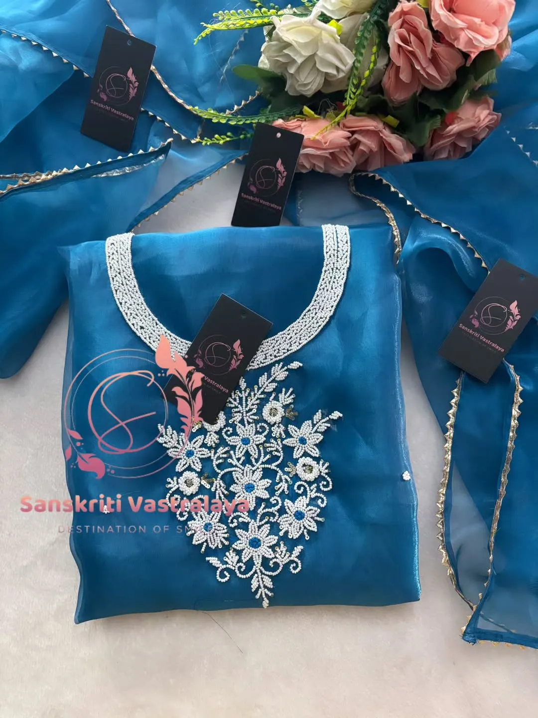Tissue organza fabric kurta with pearl handwork