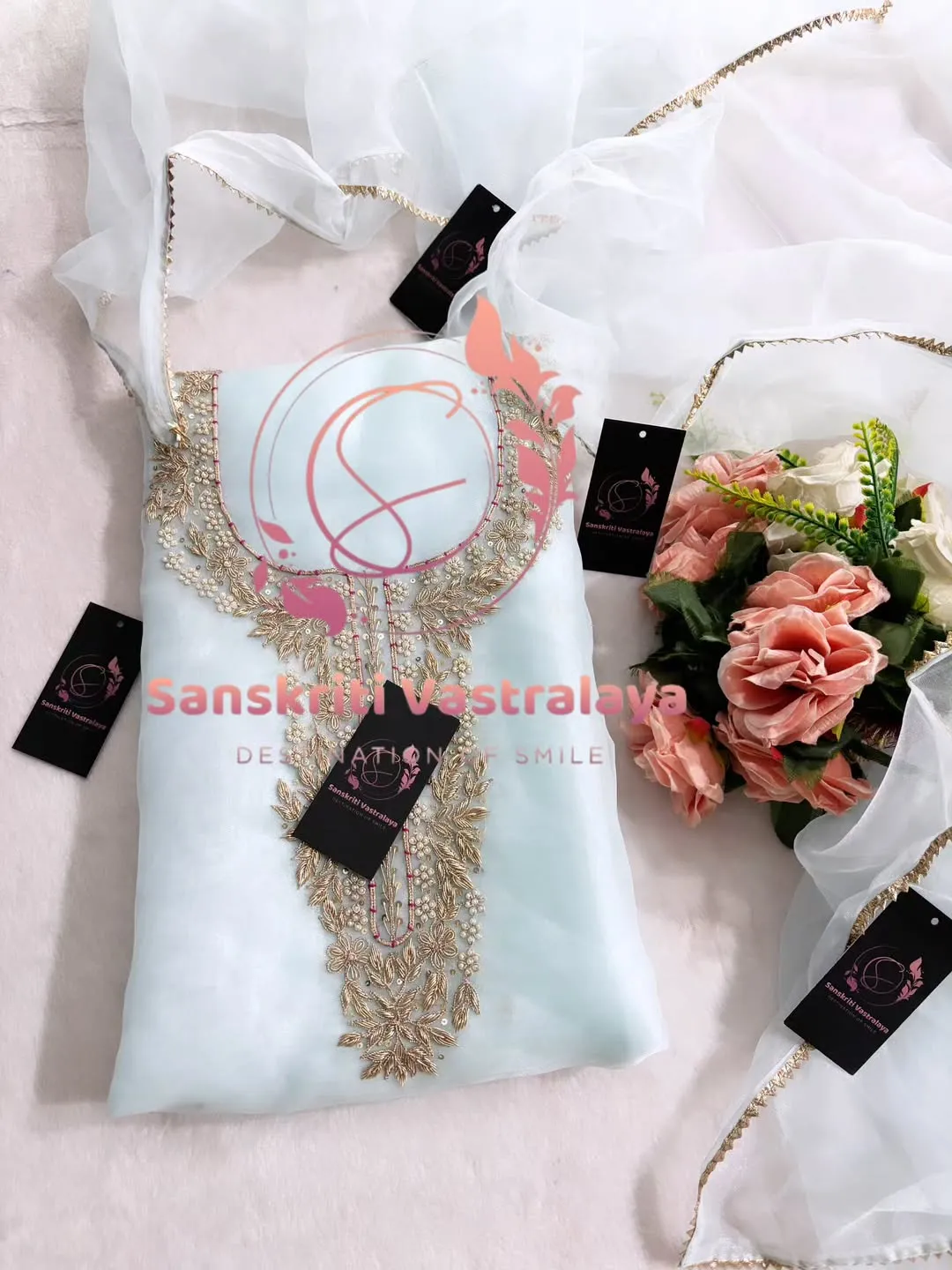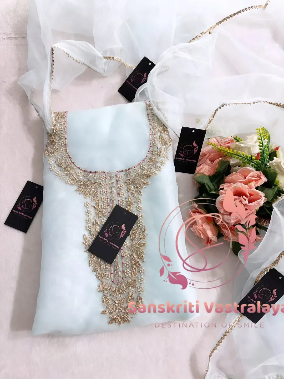 Tissue organza fabric kurta with zardozi handwork